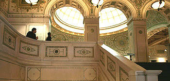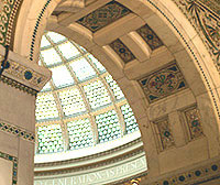 | Free Chin worked in the Library in the late 1960's and wrote, "I used to work in the building when it was still the Central Library. There was a massive open framework of steel behind the main circulation desk that housed the closed storage stacks. This was only open to staff like me and housed overstock of books that were not out in the open stacks. It was a 2-story structure that on the second level had a floor made up of translucent glass blocks about 4" square. I never really noticed the dome back then." |