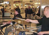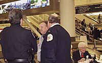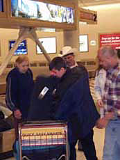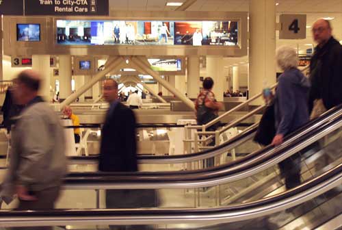 | Last night there was the opening of the ASMP exhibit Good Morning Chicago, sponsored by the City of Chicago and the Department of Aviation, in the baggage claim area of Midway Airport. The exhibit displays the work of 12 ASMP photographers and their photographs of Chicago scenes. Not only did the opening celebrate the ASMP exhibit but also Chicago Public Arts Program pieces throughout the airport.