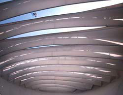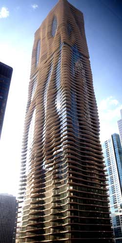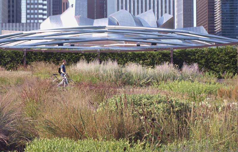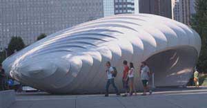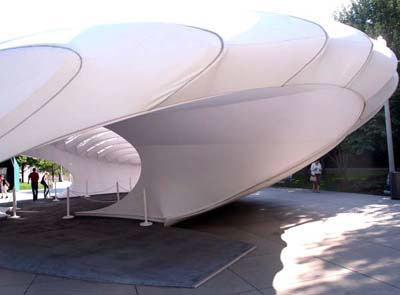 | ...as part of the Burnham Centenial celebration there are two temporary futuristic pavilions, the Pavilion Projects. In his article about the pavilions the Tribune's Blair Kamen asks "Can the public love public art to death?" because of the damage done to the structures by people wanting to climb on them. |