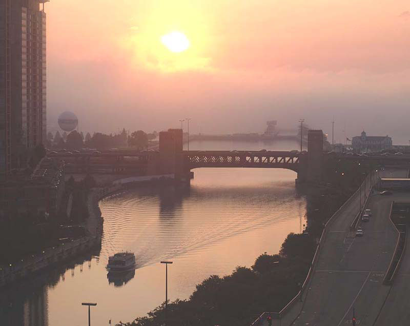 View from hotel room (google satellite view) facing east up the Chicago River. |