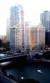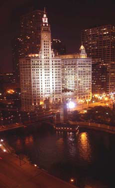 | View from hotel room facing northwest of the Wrigley Building and river in three lights (the Wrigley Building again) and, on another trip, the Agua Tower.