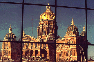 The Iowa State Capital Building reflected in the building across the street, Des Moines, Iowa.